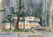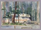 DescriptionThe advent of the RV and increased access to the outdoors through roads being built into National and State Parks completely redefined the way that Californians interfaced with the outdoors, allowing people to sojourn to nature in relative comfort. This Hugh Duncan painting of his Minnie Winnie at Twin Lakes is very much a continuation of the Plein Air tendency to capturing places and things dear to the artist.